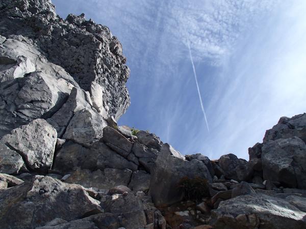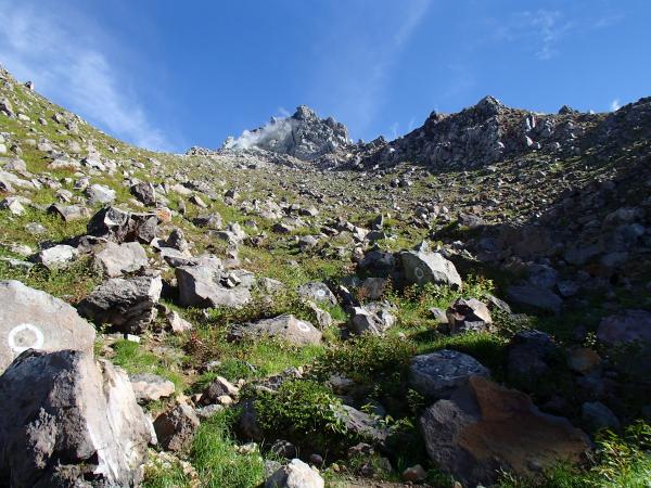 南峰は立ち入り禁止なので北峰直下の岩壁を回り込み焼岳山荘方面にお散歩です☆ あちこちから水蒸気が立ち昇り岩肌があらわになっていて、中の湯温泉から登ってきたルートとはまた違った焼岳の顔を見ることが出来ます。