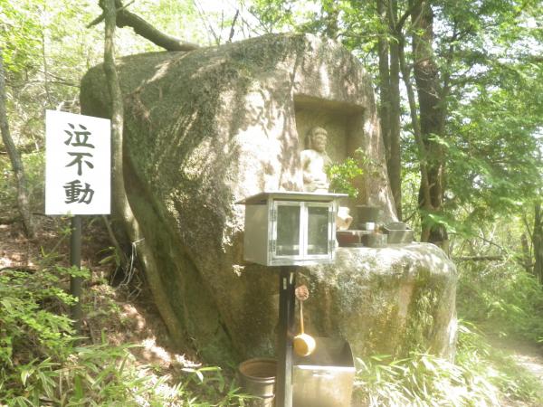 - 駐車スペース>3分>登山口>25分>泣不動>7分>二尊門>8分>不動寺>10分>山頂>22分>二尊門>18分>地蔵堂>20分>駐車スペース