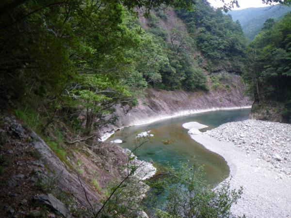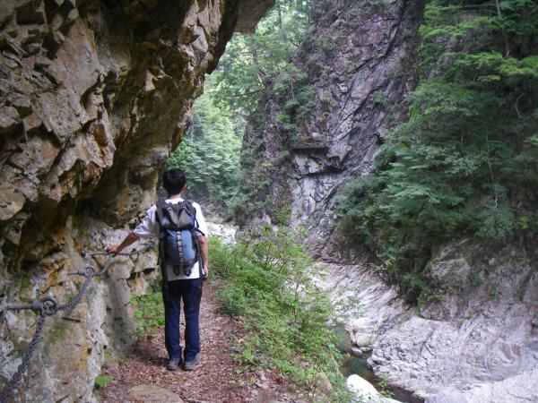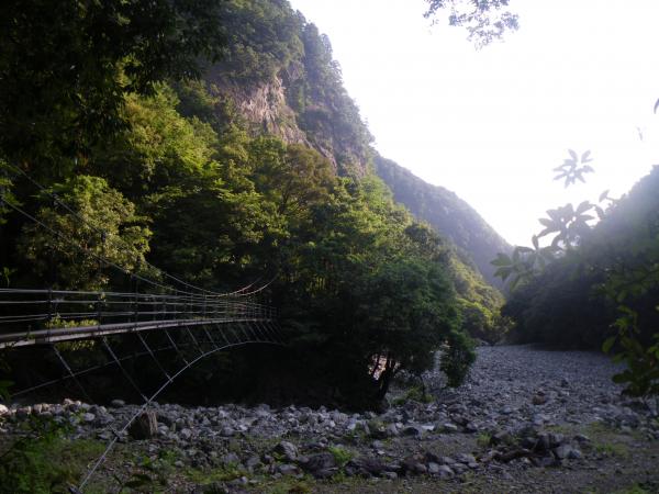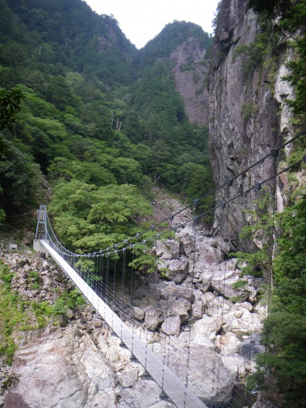 今年は空梅雨でほとんど雨が降っていないと小屋の方が話していましたが、峡谷沿いはコケが多かったです。数箇所でまるで黒部の下の廊下のような岩盤をくりぬいた登山道を通過しますが、下の廊下よりはやや道が広く、安心です。基本的に全区間、河原沿いの道で、スリップ注意で、特に雨の日は危険です。40mくらいの吊橋が多く、適度に滝がでてくるので、面白いコースではあると思いました。道が開通したら、全区間、行きたいと思います。