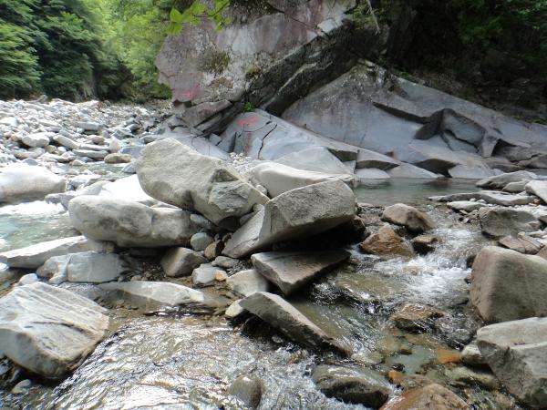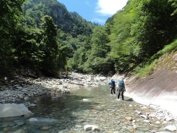 西沢渓谷駐車場→(30分)→吊り橋→(60分)→ホラノ貝のゴルジュ→(80分)→山の神→(35分)→乙女の滝→(15分)→東のナメ<お昼ご飯>→(70分)→釜ノ沢出合→(100分)→両門の滝→(55分)→16:50 広河原 ※ビバーク地
