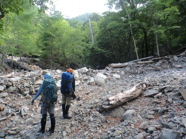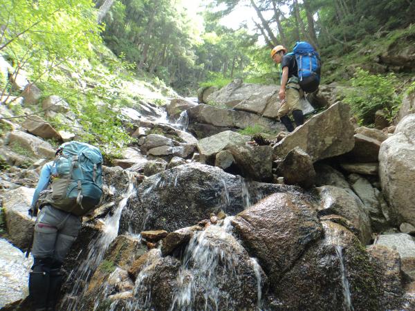 吊り橋を超えて、鶏冠谷との分岐までに2回ほど渡渉があるが、鶏冠谷を超えてからはしばらく左岸の登山道を行く。