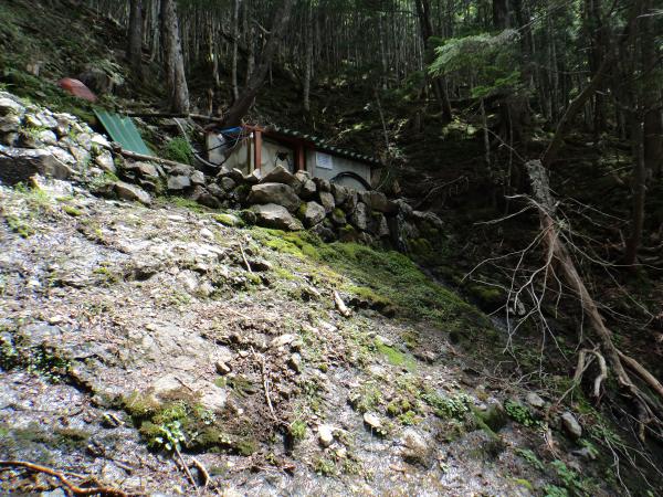 やがて沢水が尽きて、左に大きなガレ場が見えてきたらポンプ小屋。