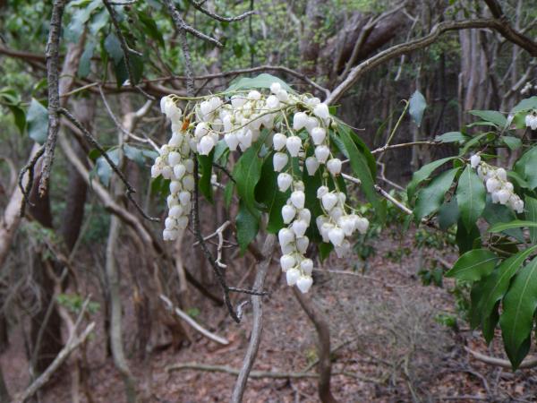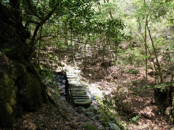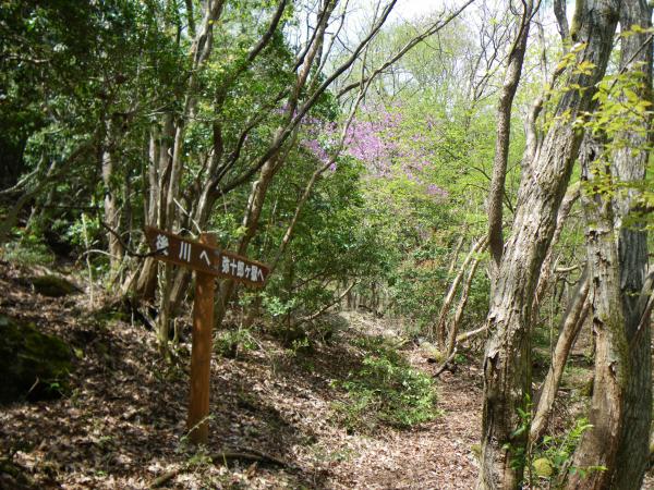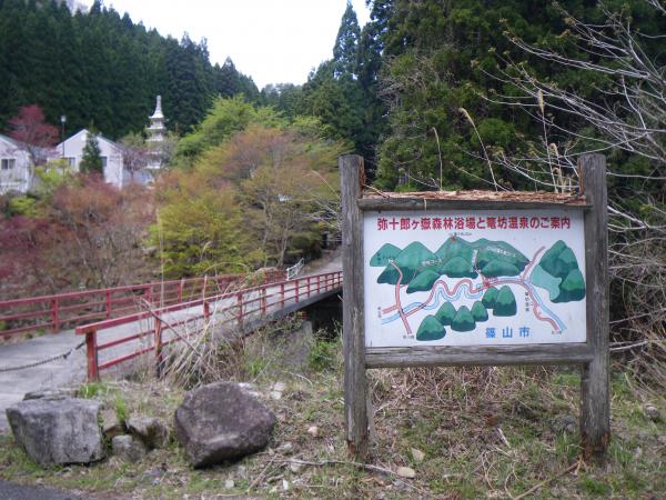- 竹谷林道入口(14分)登山口(45分)弥十郎ヶ岳(40分)籠坊分岐(20分)下籠坊バス停(49分)後川バス停(5分)竹谷林道入口