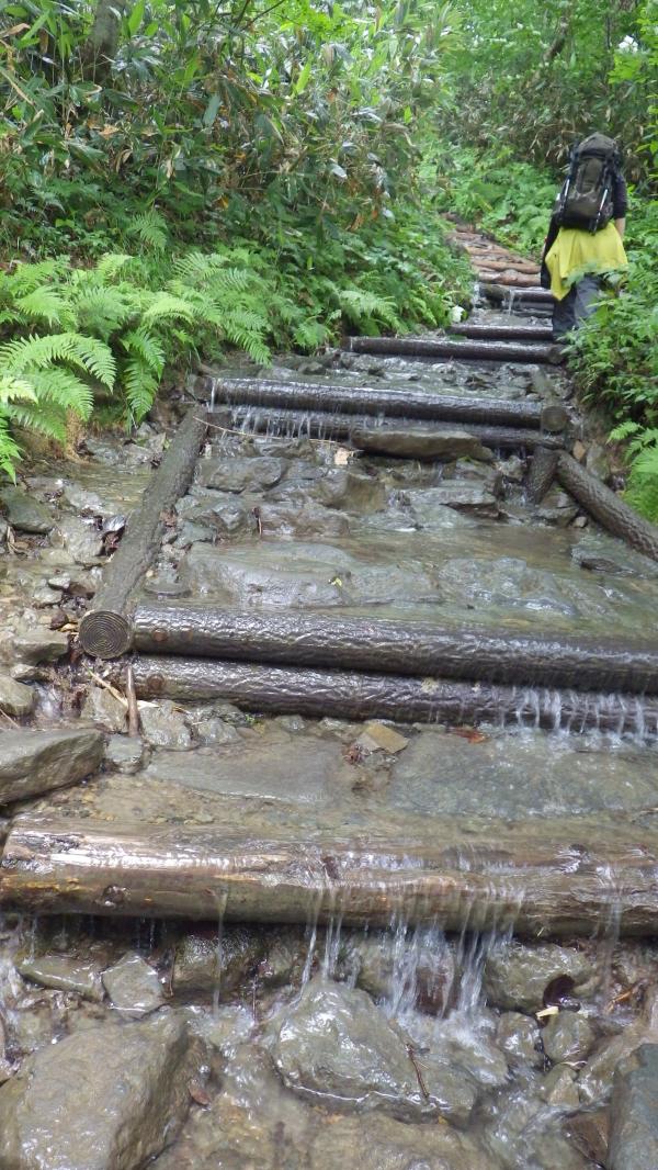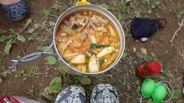 深夜0時をまわる頃、激しい音で目が覚めた。雷の音。テントの屋根を打つ雨音だ。時折雷の光にテントの中も明るくなった。ゴーゴーと水が激しく流れる音もする。慌てて外を見てみたら、外に置いてあったサンダルはプカプカ浮いており、登山靴は半分くらい浸かっていた。朝ごはんにしようと昨晩の夜ごはんのチゲ鍋で作った雑炊ももうすぐ浸水する寸前だった。テントもペグで打ってある角は地面とつながっているものの、自分たちが居る部分は水たまりに浮かんでいる状態。まさにウォーターベットのようだった。なんと水はけの悪いところに張ってしまったのだと後悔した。