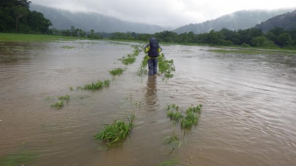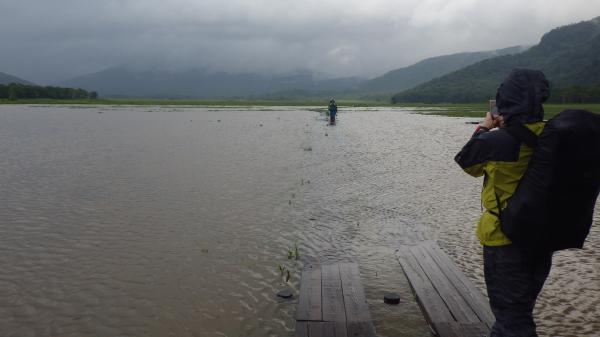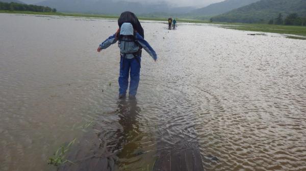 少し寝るも、いつテントが浸水してもおかしくない状況で寝ていられず3時頃撤収し、4時すぎに空が明るくなると同時に歩き出した。きのうお花を見ながら歩いてきた木道は所々冠水していた。一番ヒヤヒヤしたのは、木道が外れかけて浮かんでいる上をサーカスさながら渡ったこと。深いところで膝下くらい。足首から靴の中に水がどんどん入ってきた!気持ち悪い!そんな冷や汗の木道を過ぎ、山ノ鼻キャンプ場に着くころにはだいぶ神経が擦り減っていた。その頃には、本日尾瀬入りの方々が続々と歩いてきた。登山靴ではない方、レインウェア着ていない方、たくさんいた。この先とっても危険だけど大丈夫かな?(汗)鳩待峠に着いてなお、続々と尾瀬入りバスが到着した。