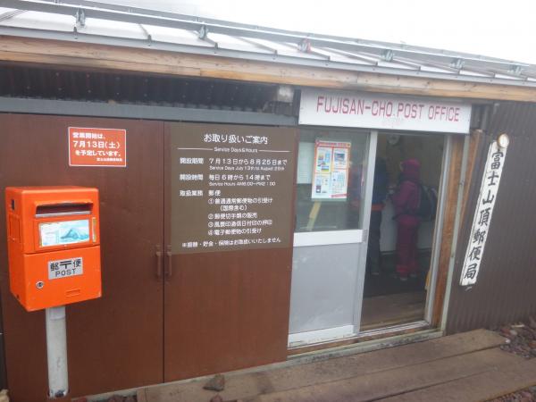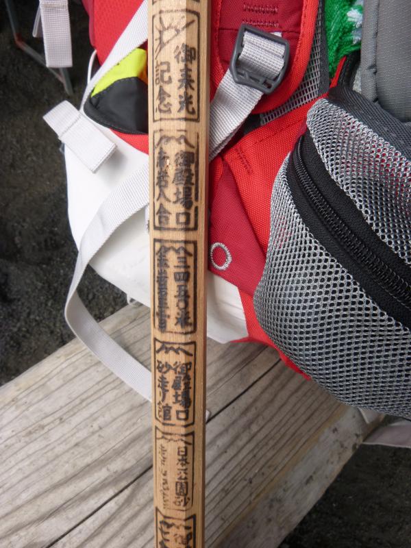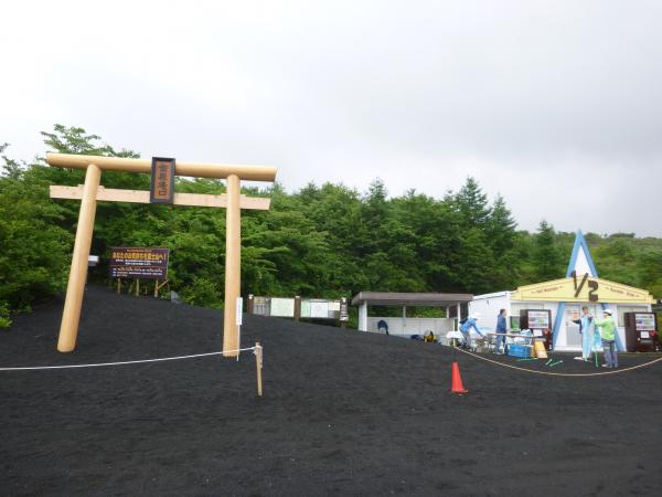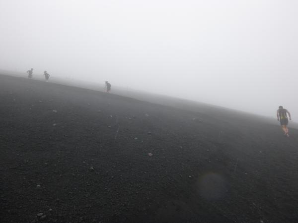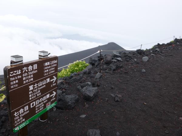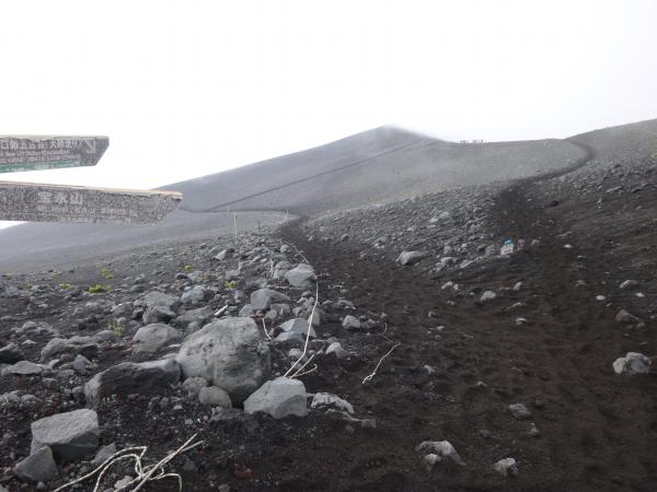 [1日目]1日目はあいにくの雨!雨具を着て出発です。砂に足を取られながらも登っていきます。周りには走っている方が多く、どうやら8月4日に行われる富士登山駅伝の練習のようです。この道を走って登るなんて、本当にすごい。ガスって周囲は真っ白です。道ははっきりとしています。六合目小屋(休業中)の前で休憩。この時は雨は一旦止んでました。そこからさらに登って六合目。この辺りから雨が激しくなってきました。それにだんだんと風が強くなってきました。