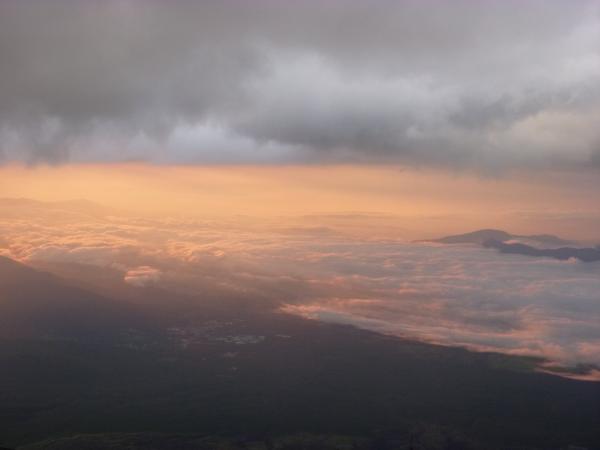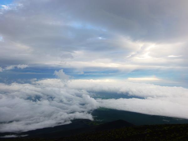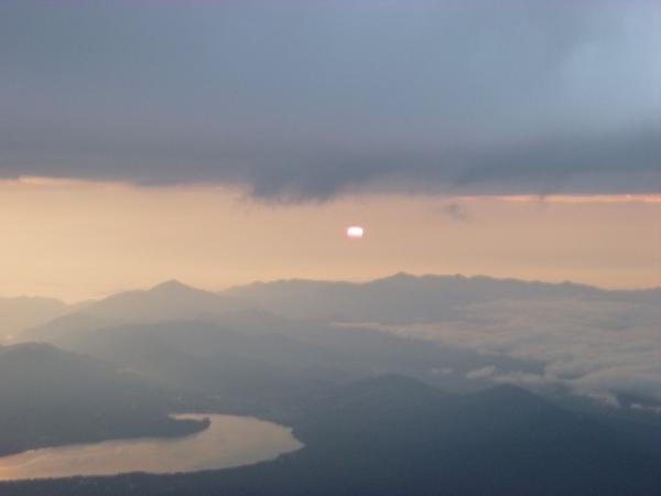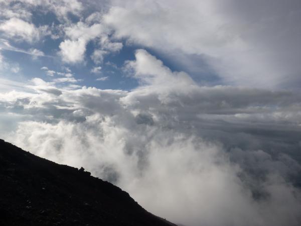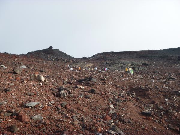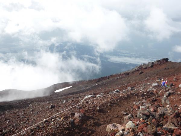 [2日目]朝4時半に出発しました。きのう小屋の方に尋ねたら、「日の出は4:50頃」とのこと。八合目に登る途中で見れればいい、そんな考えで登りました。雲が分厚く、太陽はぼんやりと見え、すばらしいご来光とはいかなかったですが、それでもオレンジ色の雲はきれいでした。赤岩八合館をすぎて、しばらく登ったあと道は左へ曲がり、山頂までのつづら折りの上りが現れます。