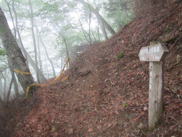 この山道はかつて秩父からの雁峠越えに使われていた道で、釣橋小屋跡から通り尾根沿いに上がり笠取山北面をトラバースしていたらしいですが、現在はもちろん完全な廃道です。