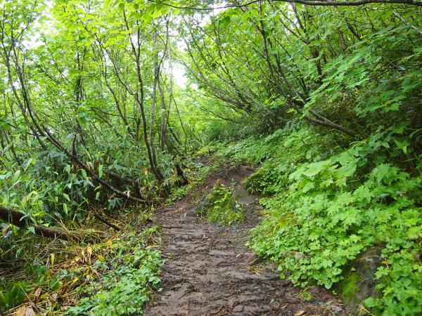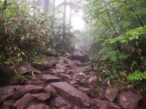 黒沢池分岐から山頂まで急坂をひたすら登ります。展望はなく、晴れていても暗く気持ちが少し滅入りますので要注意です。