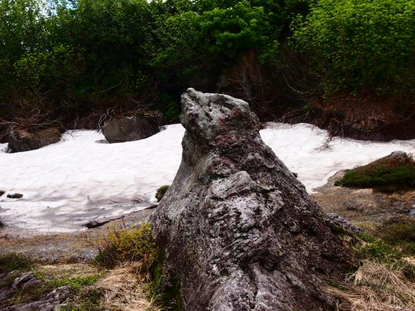 黒沢池ヒュッテ~妙高山は道が少し荒れ気味だが道しるべはしっかりあるので特に問題はなし。途中に雪渓がありますが、アイゼンの必要はなく、問題なく歩けます。