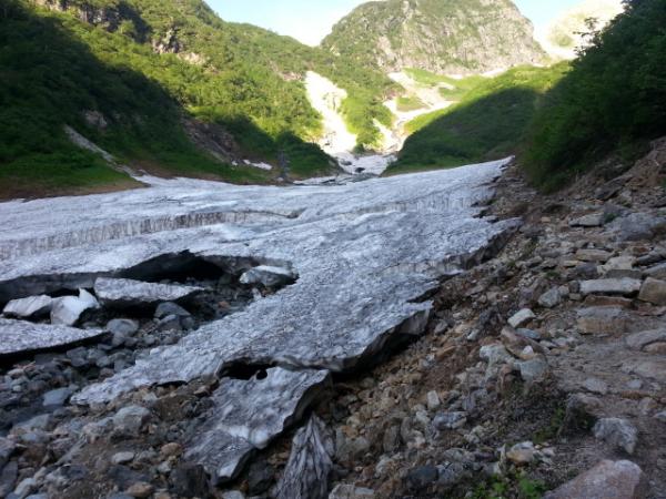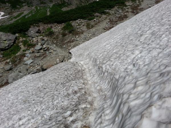 どこから雪渓にアプローチしていいのかわかりにくい。