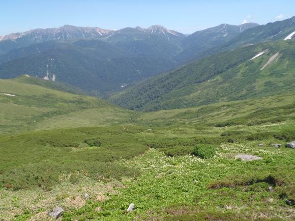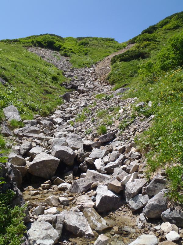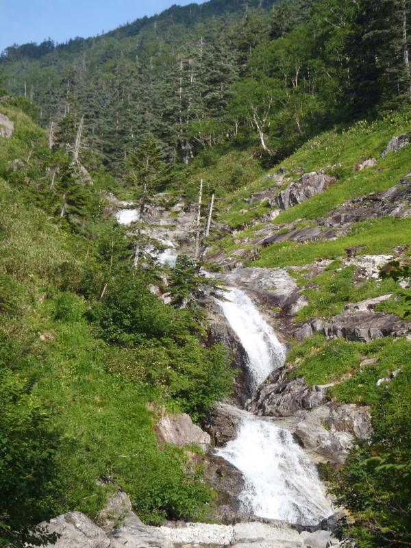 赤木沢は、快適にほぼ直登できますが、滝2箇所高巻き。大滝の巻きは少し戻った左岸草付きの斜面。途中部分的に念のためロープを出しました。確保なしでも登れますがスリップ等ミスが転落につながります。詰めは大滝上左岸2本目を詰めて赤木岳北側の鞍部へ。