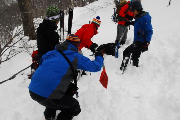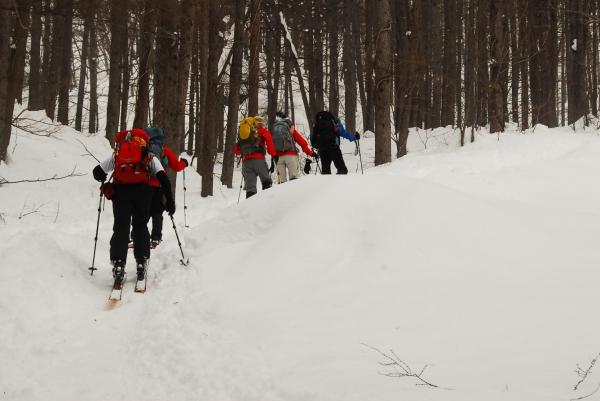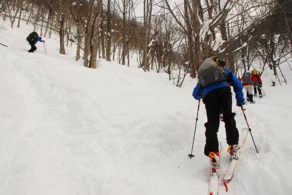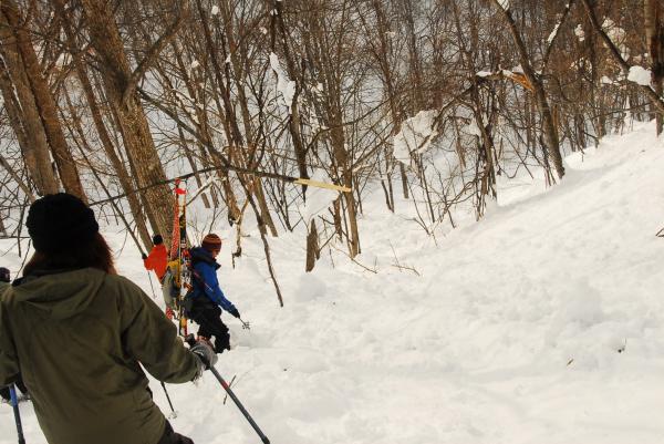 (画像にはスキーの板であがっている人もいますが、せまい道や洞窟直下の登りには適さないと思います)