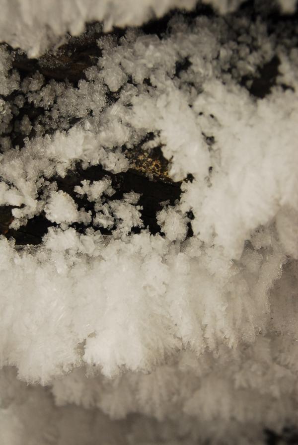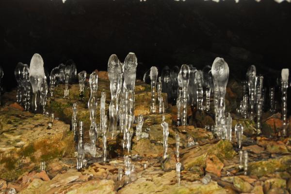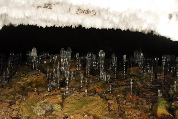 この洞窟は氷筍も有名ですが タイミングがあえば洞窟の天井に立派な霜を見れることも