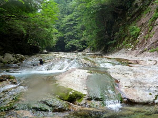 - 駐車スペース(77分)前鬼川入渓(30分)10m滝(14分)ナメ床(70分)垢離取場