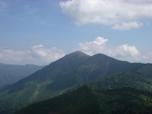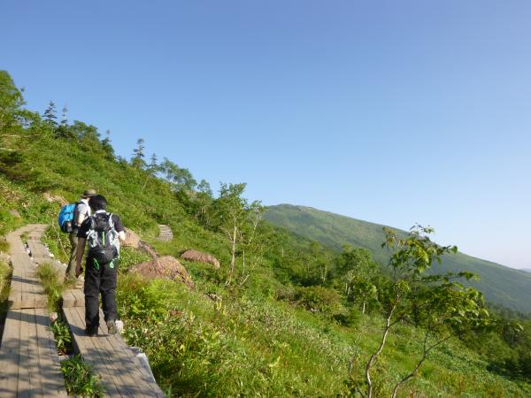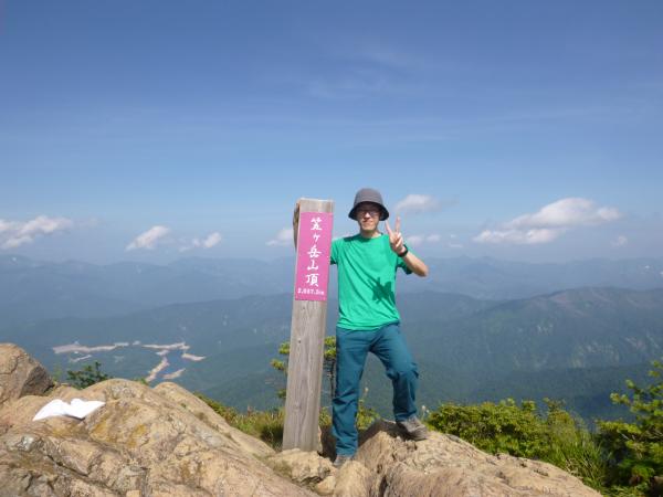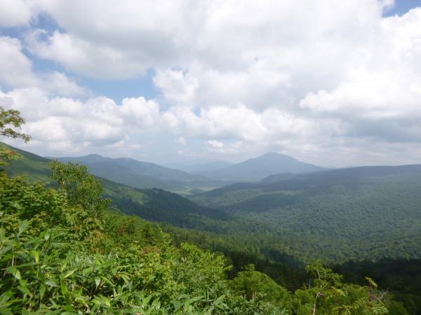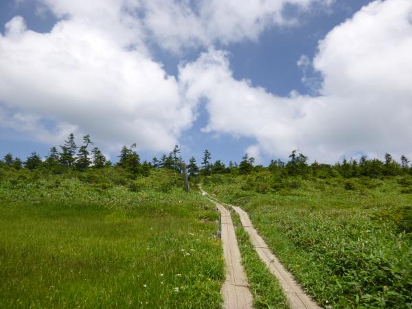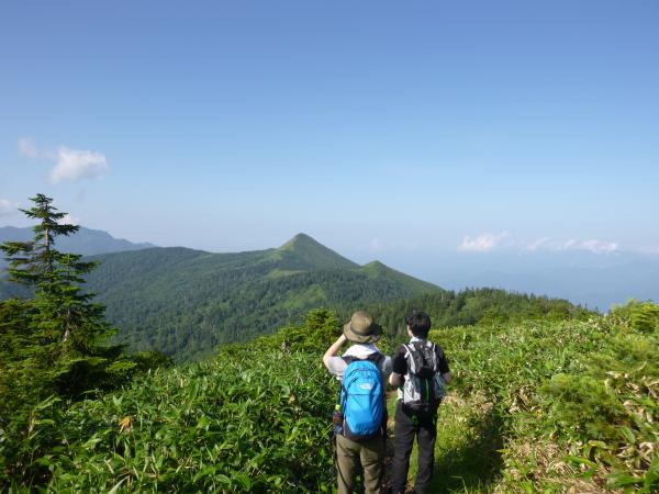オヤマ沢田代から分岐を左に曲がり笠ヶ岳方面へ。しばらくすると景色が開けて、正面に笠ヶ岳がはっきりと見えました。樹林帯に入り、小笠の横を通り過ぎると笠ヶ岳まではおよそ30分程です。笠ヶ岳の横を通り過ぎるような道を歩いていくと、ようやく山頂へ登る道が出てきます。(山頂への道標あり。)ここからは岩場の道です。最後のひとふんばりで乗り越えると笠ヶ岳の山頂に到着です。山頂からは360度の大展望で、特に新潟方面の山々がよく見えました。(巻機山や平ヶ岳など。)山頂は自分たちだけだったので、ゆっくりと時間をかけて展望を満喫しました。