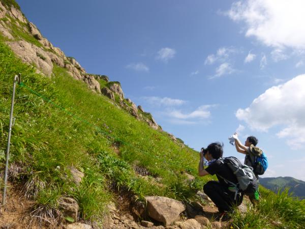 分岐にある山頂を示す標識から急坂の岩場を登っていきます。今回のコースで一番の危険箇所です。落石に注意が必要です。また、マーキング(目印)が無く、下りよりも上りに神経を使いました。