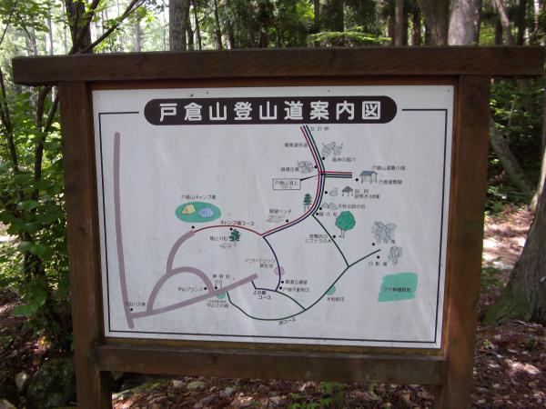 - 戸倉山キャンプ場→(40分)→馬止の松→(30分)→猿の松→(7分)→金明水→(15分)→西峰→(5分)→山頂(東峰)