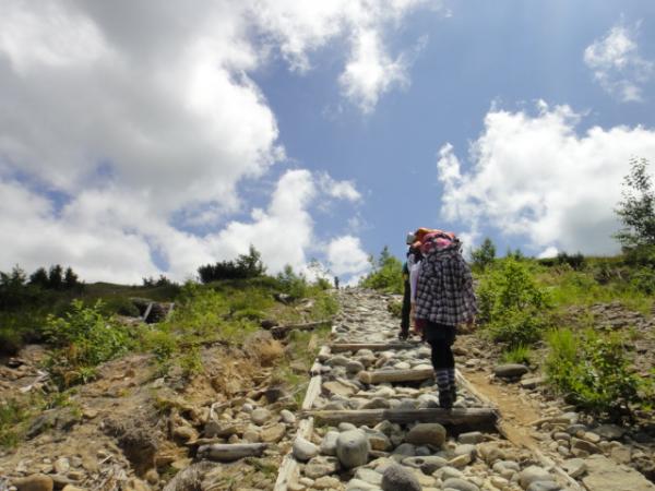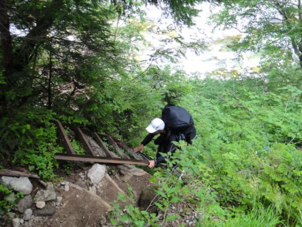 だから、今回は8年前の悪夢を払拭する良い機会!!いや、そんな生易しいものではない。これは復讐だった。この私自らの足で、この薬師沢の急登を踏み敷くのだ(8年前は半ば担がれていたんだってことは秘密だぜ)。くくく!機会を下さった安藤SMには感謝してもし足りないぜぇ。