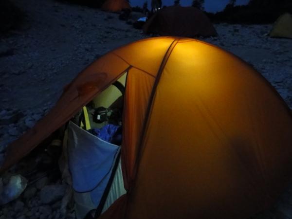 樹林帯を少し早目にやっつけ、日当たり抜群、と言うか最早オーブンな稜線へ。こんがり焼けます。薬師岳を左手に見ながら、太郎平へ案外サクッと到着。風が気持ち良かったからですかねぇ。で、薬師峠キャンプ場でテントを建てて潜り込んだら、いつの間にか夢心地。テント内から見る黒部五郎岳が印象的だった。