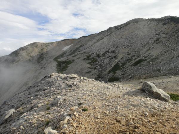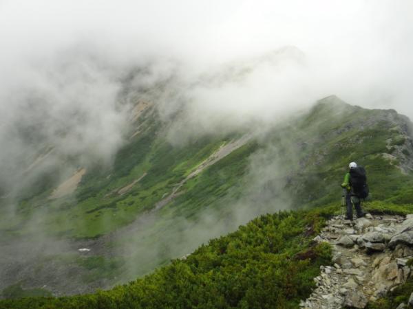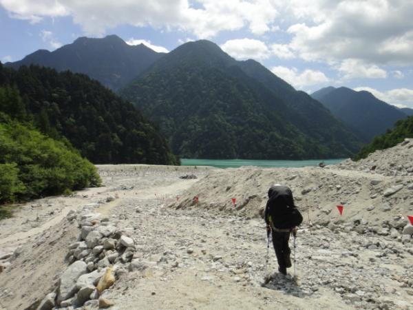 最終日。わざわざ見送りに出てきてくれた小屋のお兄様に手を振りつつ、高瀬ダムを目指す。風はそこそこあったものの、朝から晴れていて気持ち良い。そう。これだよ、これ。これがアルプスだよ!烏帽子小屋からブナ立尾根に入り、急坂をいっきに下降する。夢中である。言葉など要らなかった。トンボが多くて、日差しはきついものの空気が秋っぽい。雨後の清涼さなのかも知れないけど、そこはそれ。立秋過ぎの今日この頃はそう思いたいのである。