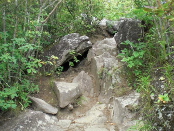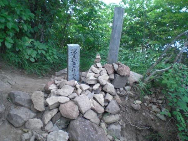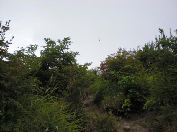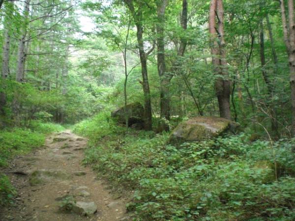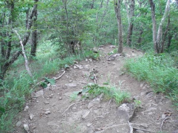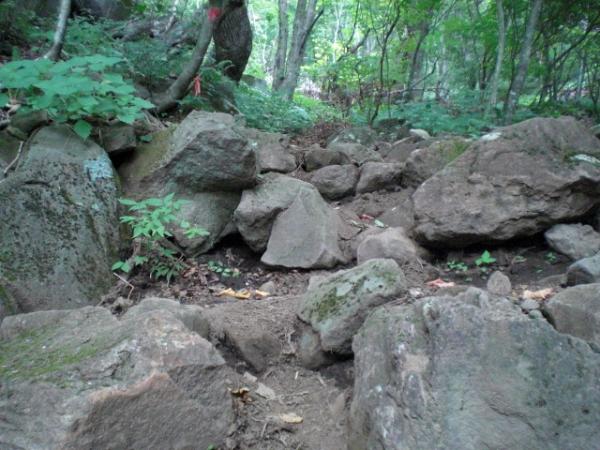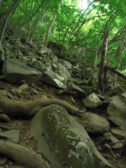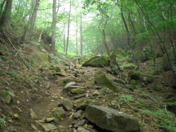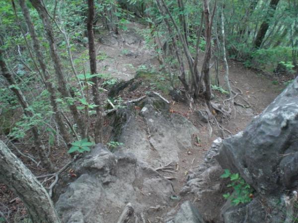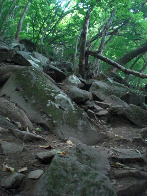 ここからが、大きめの石の多い急登の連続となります。猛暑の中、樹林帯に囲まれた急登で頭から水をかぶった様な大量の汗をかきました。有名な山の割に登山者が少ない(2人でした)理由が身に染みてわかりました。