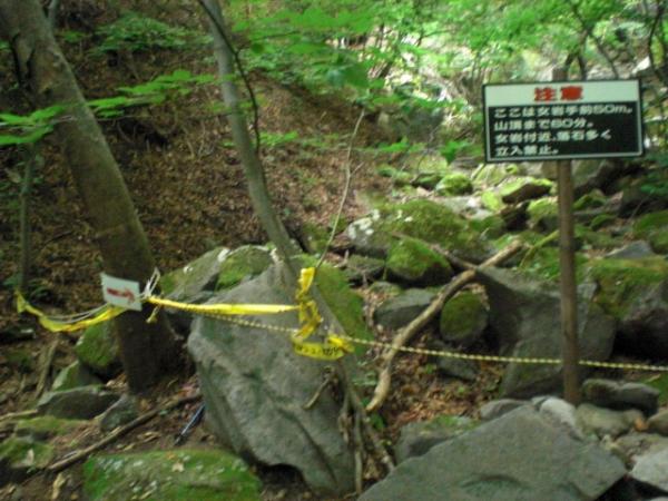 幅広めの緩やかな登山道を登ること80分。唯一の水場がある巨岩「女岩」手前へ着くのですが、現在女岩周辺は落石のため通行禁止。50m手前から女岩を巻きます。