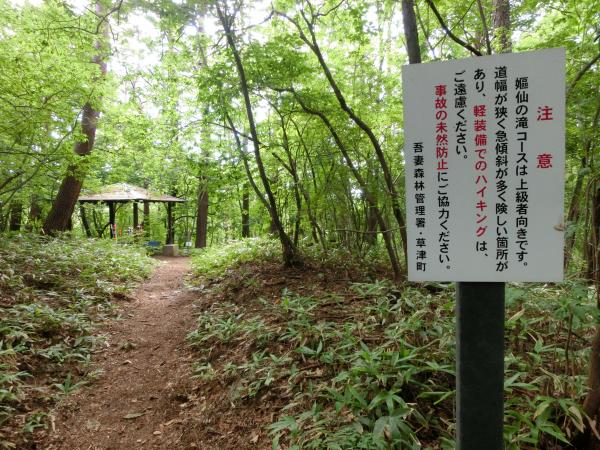 - 草津温泉バスターミナル(40分)→嫗仙の滝登山口(30分)→嫗仙の滝(25分)→カツラの木、トチノ木などの天然林(20分)→嫗仙の滝 (50分)→嫗仙の滝登山口(35分)→湯畑