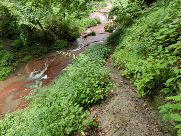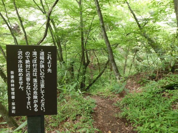 - ロープは張られているものの、道幅が常に狭く転落の危険も充分に考えられます。滝から先の天然林まで行くならば、軽装備では難しいです。