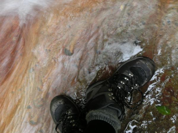 沢道具までは要りませんが、渓流沿いに歩いていくと、決まった道も無いので、途中で何度も沢を渡り、左右で行ったり来たりしてました。