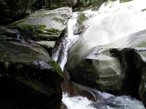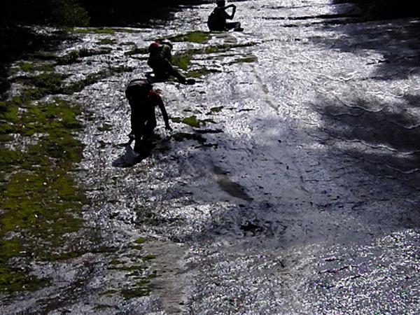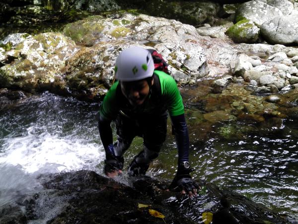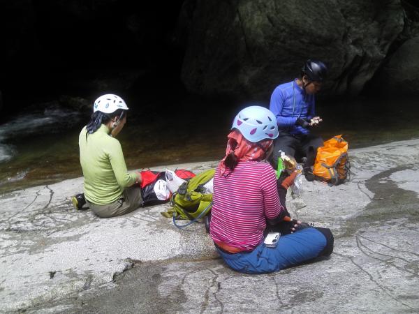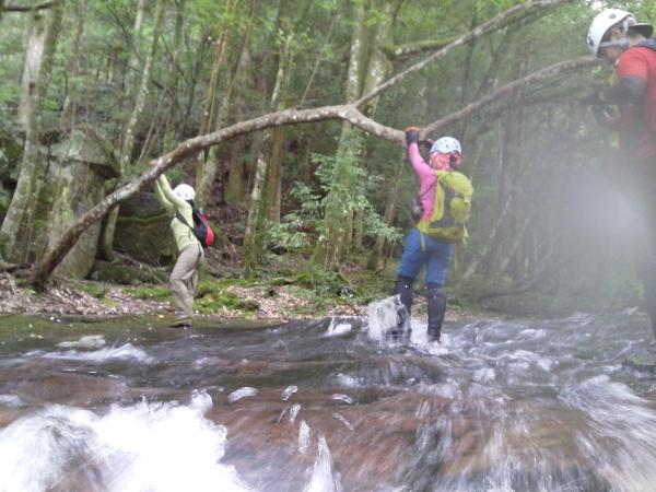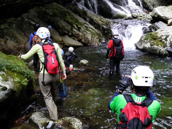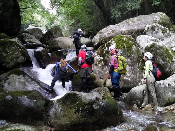 - 今回歩いた万年橋から雪輪の滝までのコースは、比較的ゆるやかななめの続く、沢登り初心者おすすめのコースです。ロープを使用する箇所はありませんでしたが、なめが続きますので、ヘルメット・沢靴は必要です。装備がしっかりとしていれば、楽しい沢登りが楽しめます。