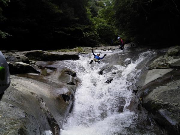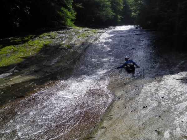 滑床渓谷は、国内でも知る人ぞ知るキャニオニングの聖地で、なめの続くすばらしい景観の場所です。今回は、好日山荘の組合企画のレクレーションで参加させていただきました。沢登り初体験の方でもすごく楽しめる渓谷です。10月の中旬から11月上旬には紅葉が素晴らしいとのこと!次回は、その時期に来てみたいと思いました。
