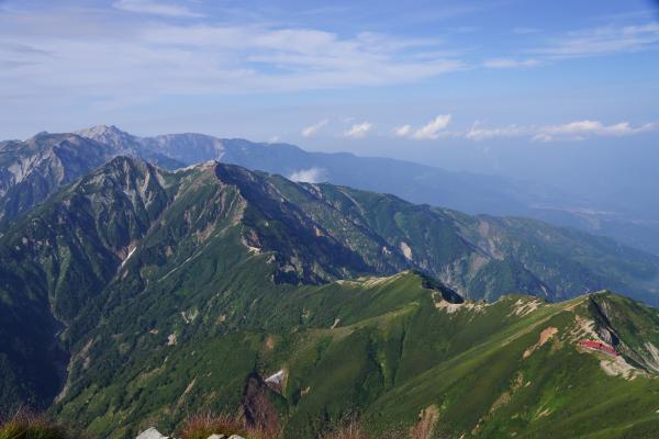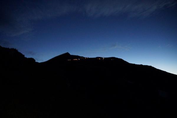 準備をして真っ暗な中を出発。だんだん明るくなり、遠く槍ヶ岳や穂高連峰まで北アルプスを一望しながら気持ちの良い稜線歩きです。