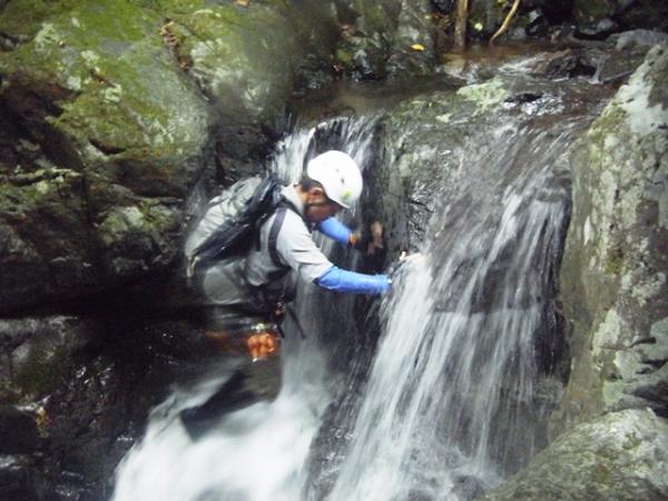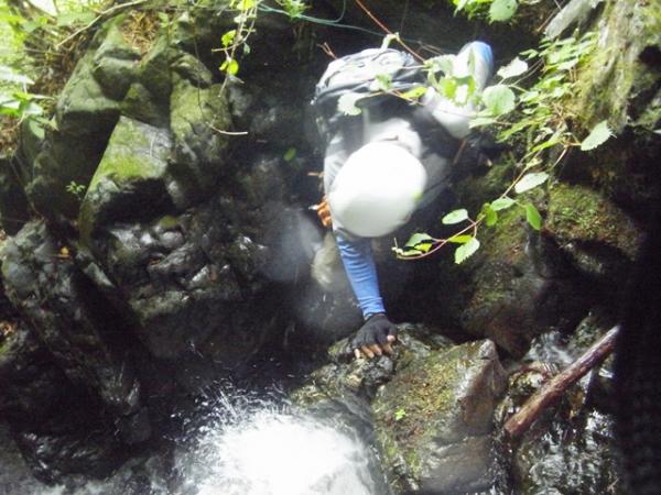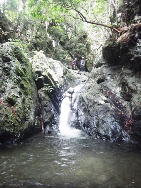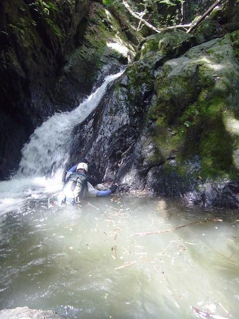 - 入渓点(8分)右岸をへつる滝(28分)水の巻く釜の滝(7分)樋状4mCS(43分)