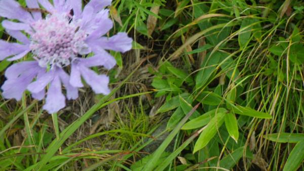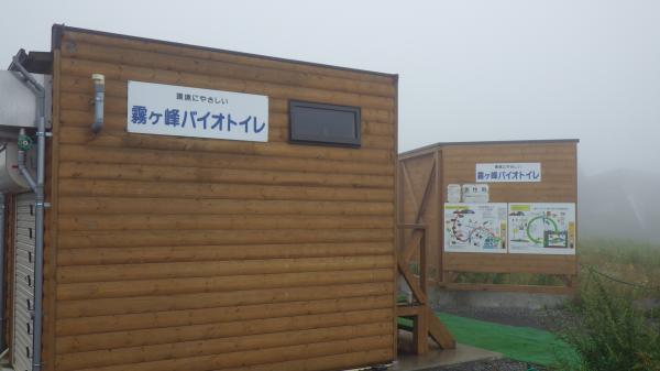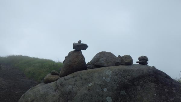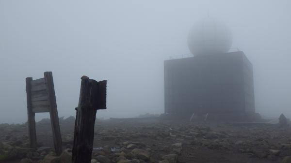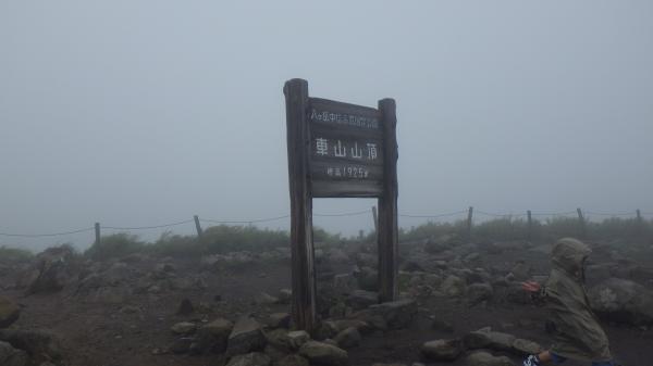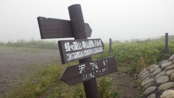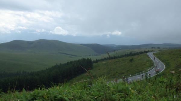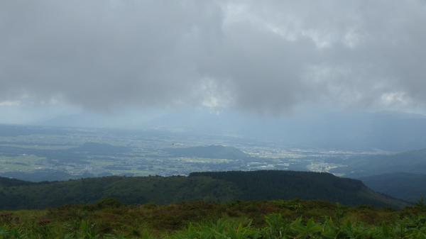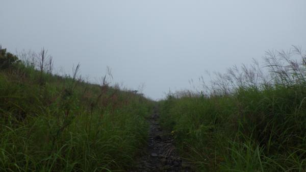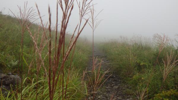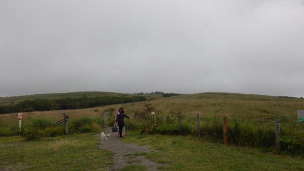 登山道はほぼ平坦と言っていいほどの石ころ道。いつも登りで疲れて息切れの私でも早足で歩けました。霧の中視界はほとんどゼロでしたが、これはこれで幻想的で良いなぁ、と。ミストシャワーの中のお散歩は気持ちが良かったです。あっという間の頂上。下山時は少し霧が薄れてきて、まわりの高原の景色が見渡せました。カントリーロード♪って歌いたくなるようなほのぼのした雰囲気に癒されたのでした。