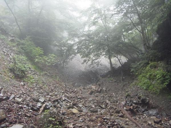 二俣からすぐに崩落地になるがそこからは土砂が沢を埋めているので退屈になる。最奥の二俣を左俣に入ると枯滝があるがその上は危険なので右岸の支尾根に取り付き稜線を目指した。