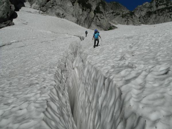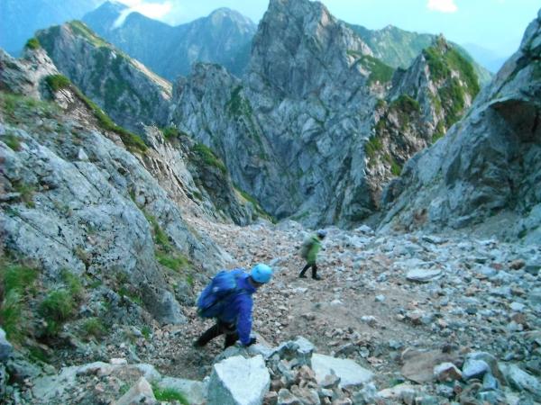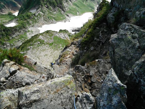 長次郎谷右俣の雪渓は、苦労せずに通過できました。上部に約50mくらい残っていました。下部に崩壊箇所があったので、大きく巻きました。アイゼン・ピッケルは必要でした。