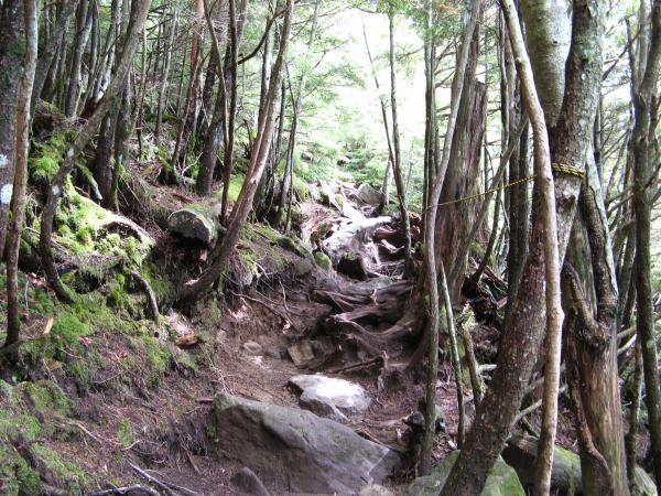 いきなりの急な階段と急傾斜の登山道に汗がポタポタと顔から流れ落ち、息が上がります。
