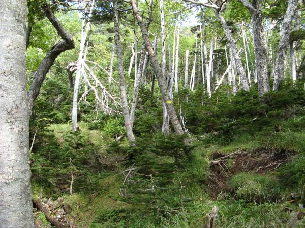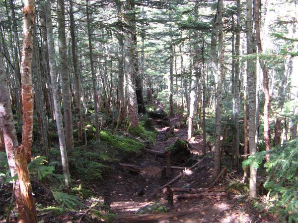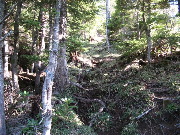 馬立からは一度大きく下ってから沢を渡り荒沢出合に出て、そこから唐沢小屋を目指します。樹林帯の中の道をひたすら登るのですが、これがなかなかの急登。