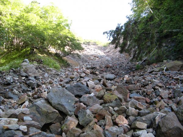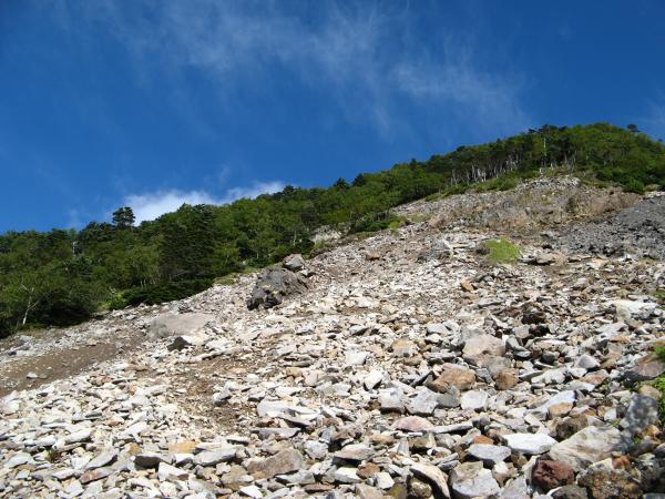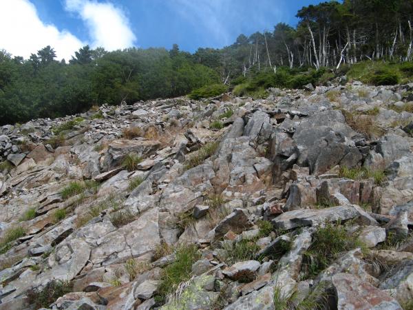 女峰山頂上手前のガレ場は広くなっているので、ルートを見失わないように注意しましょう。
