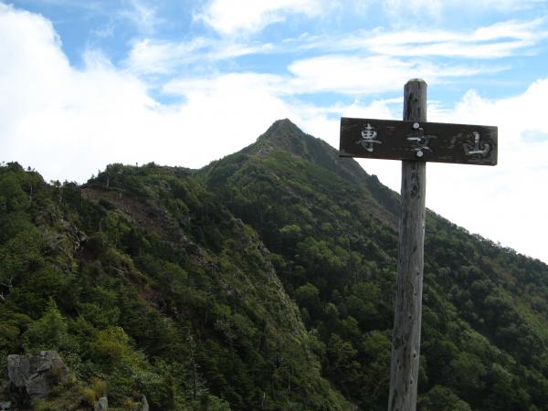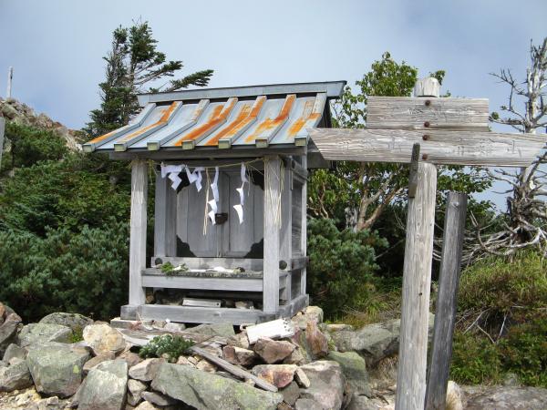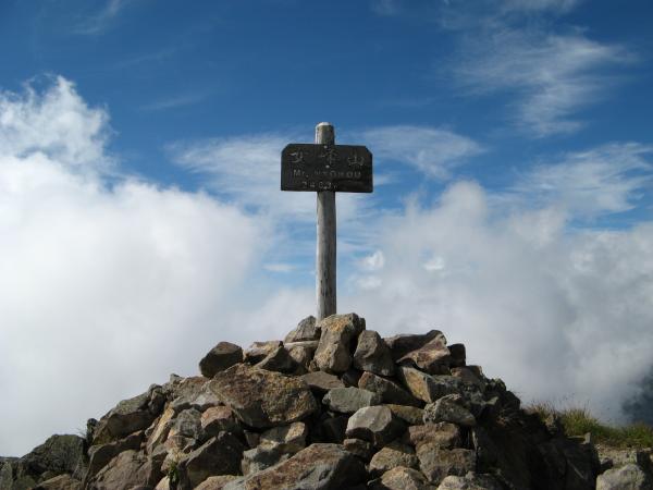 避難小屋の前で休憩をして出発。しばらく歩くと突然見晴らしが良いガレ場が現れます。少し長く休憩したせいか足取りが重く、のろのろペース。頑張って岩場を登り、短い樹林帯を抜けるとそこが女峰山の頂上です。