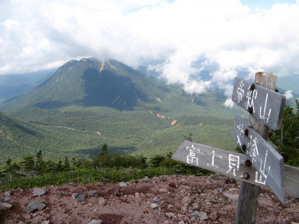 頂上は風が強く少し肌寒いので防寒着を着て周囲を見渡しますが、ガスが多くて景色は見えたり見えなかったり。