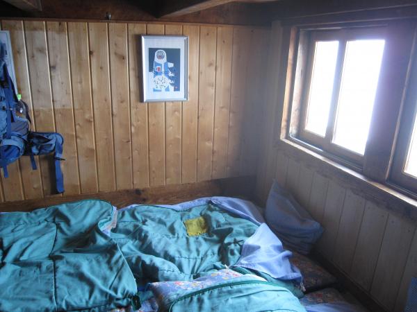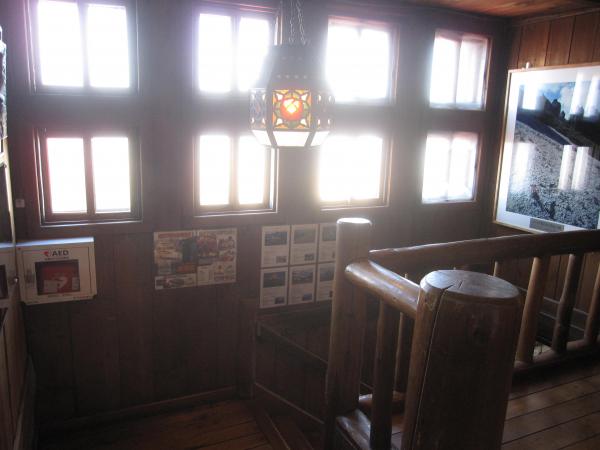 山小屋というより、ログハウスのような小屋内は、寝床にも山男の絵が飾られていたり、階段にステンドグラスのライトがあったり。