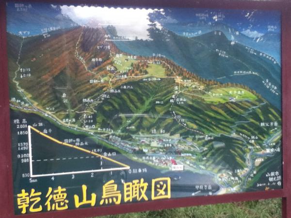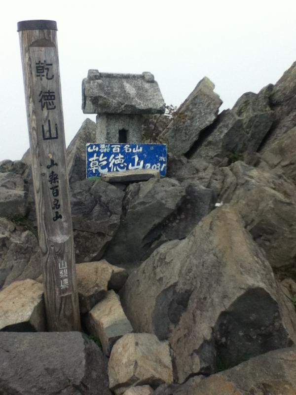 - 駐車場→乾徳山登山口(20)→月見岩(90)→乾徳山(50)→高原ヒュッテ(80)→駐車場(90)