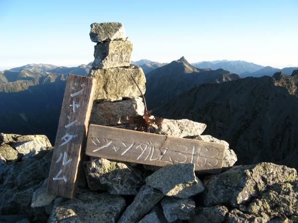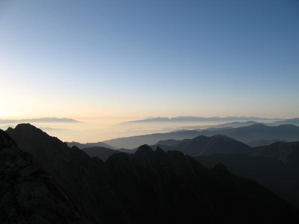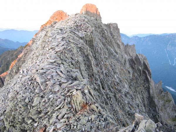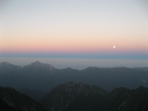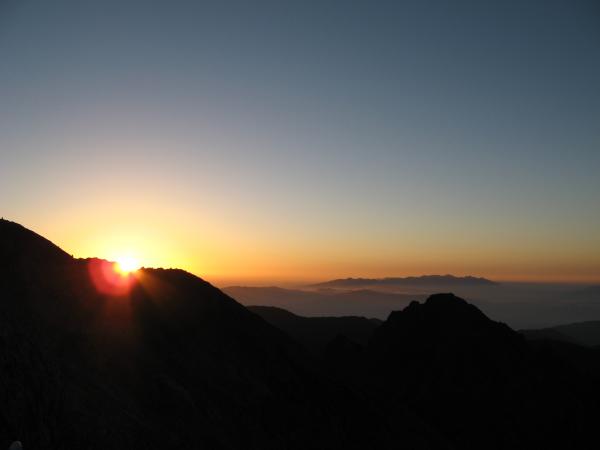 2日目。まだ暗い時間にヘッドランプを装備して登山を開始しましたが、奥穂高岳に着く頃にはだいぶ明るくなってきました。