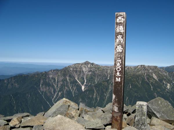西穂高岳頂上でも天気は雲ひとつ無い青空。素晴らしい景色を眺めながら休憩をして出発。