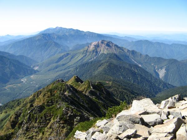 その後ジャンダルムへ登り360°の絶景を堪能。この日も昨日に引き続き奇跡の晴天となり、雲やガスはまったくなく日本中の山が見えるんじゃないかと思えるほど遠くの山まで見ることができました。