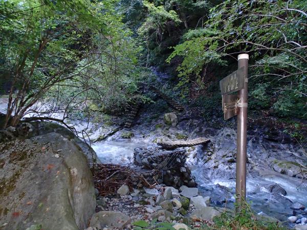 - 大滝橋(30分)入渓点(120分)二俣(60分)鬼石沢(90分)一軒屋避難小屋(90分)大滝橋