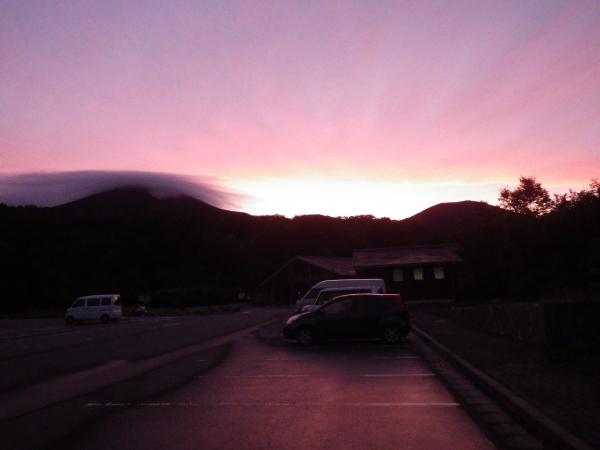 朝焼けでピンク色に染まる八甲田山を望みながら、仮眠を取る間も無くモソモソと準備を始める