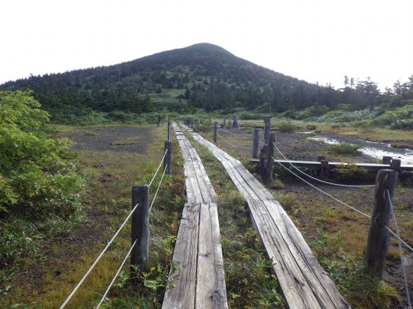 すると今度は木道が現れ、その先に大きな山が現れた